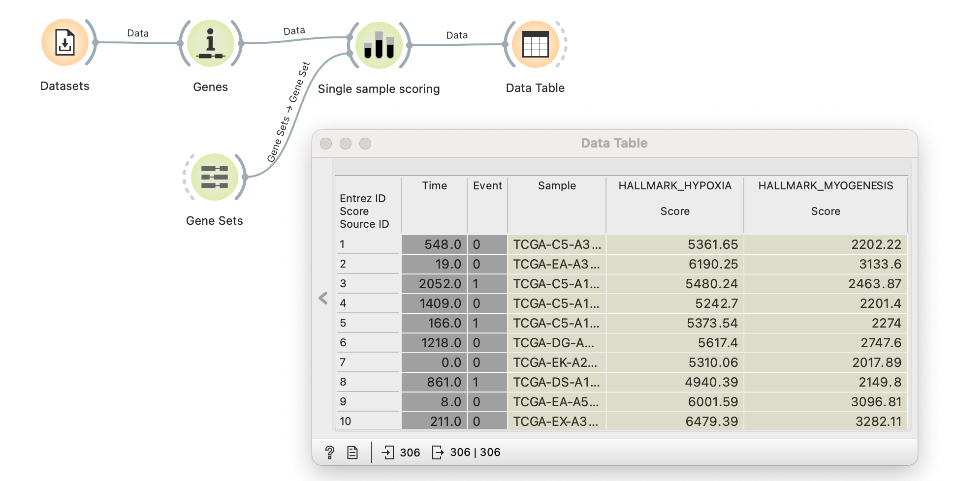 The illustration above demonstrates how to perform single-sample GSEA analysis on the TCGA Cervical carcinoma data (TCGA-CESC) from the Datasets widget. ssGSEA method is the default option for scoring in the Single sample scoring widget, which takes two parameters: expression data through the Genes widget and gene sets through the Gene Sets widget. As seen in the Data Table widget, sample scores are added as metadata parameters to the original data. Users can now easily compute gene set scores and enrich their analysis.