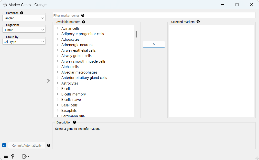 - For more details about a particular marker gene, simply click on it to view information in the Description panel.