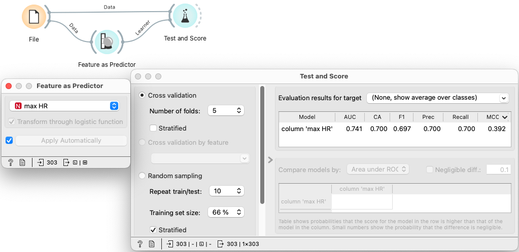 How well can we predict the heart disease based on the maximal heart rate? Here we connect the Feature as Predictor widget to the Test and Score widget to evaluate the model on unseen data. In this case, Feature as Predictor provides a learning algorithm that fits a logistic regression model to the feature's values.