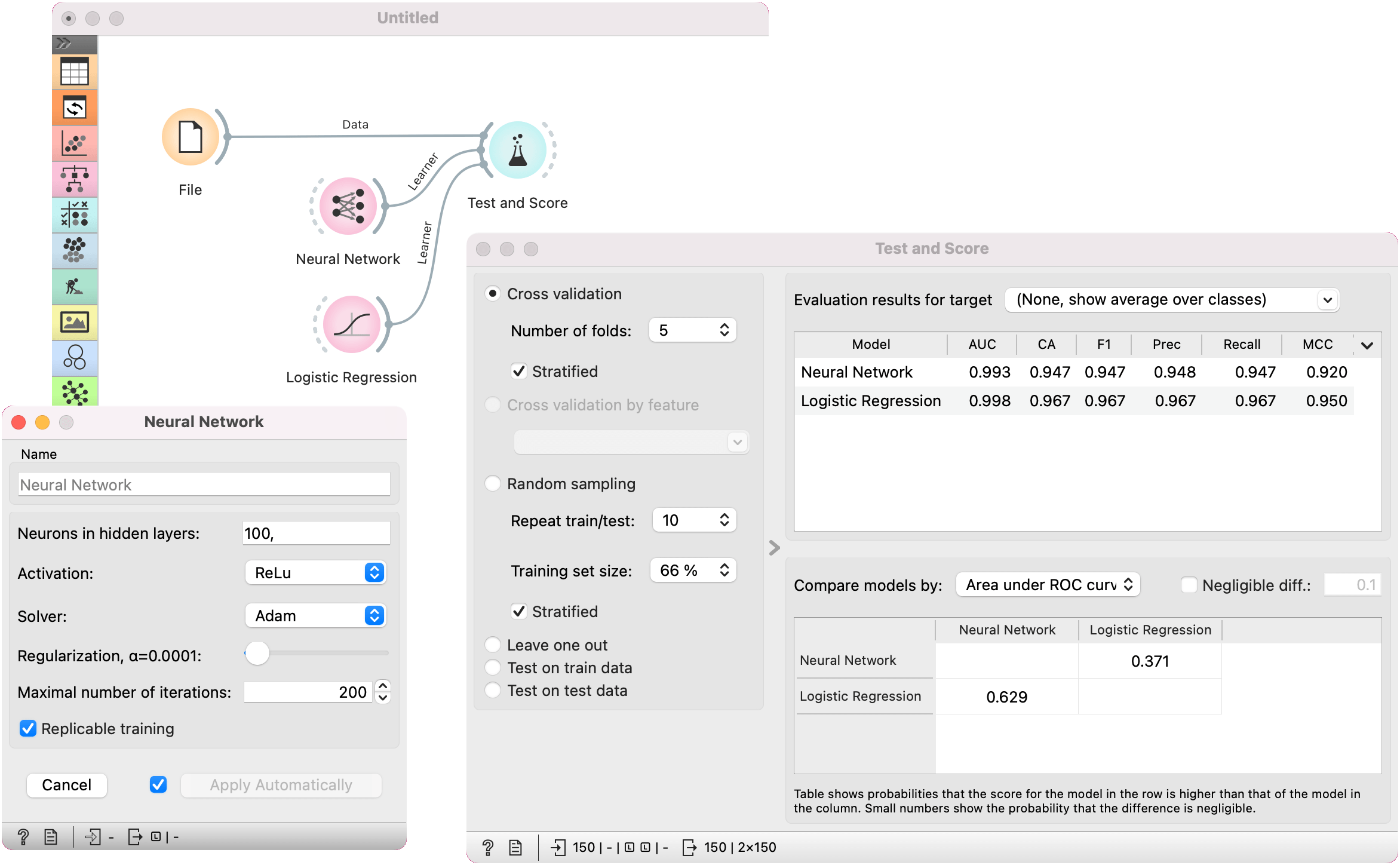 The example is a classification task on the iris dataset from the File widget. We compare the results of Neural Network with the Logistic Regression in the Test and Score widget.