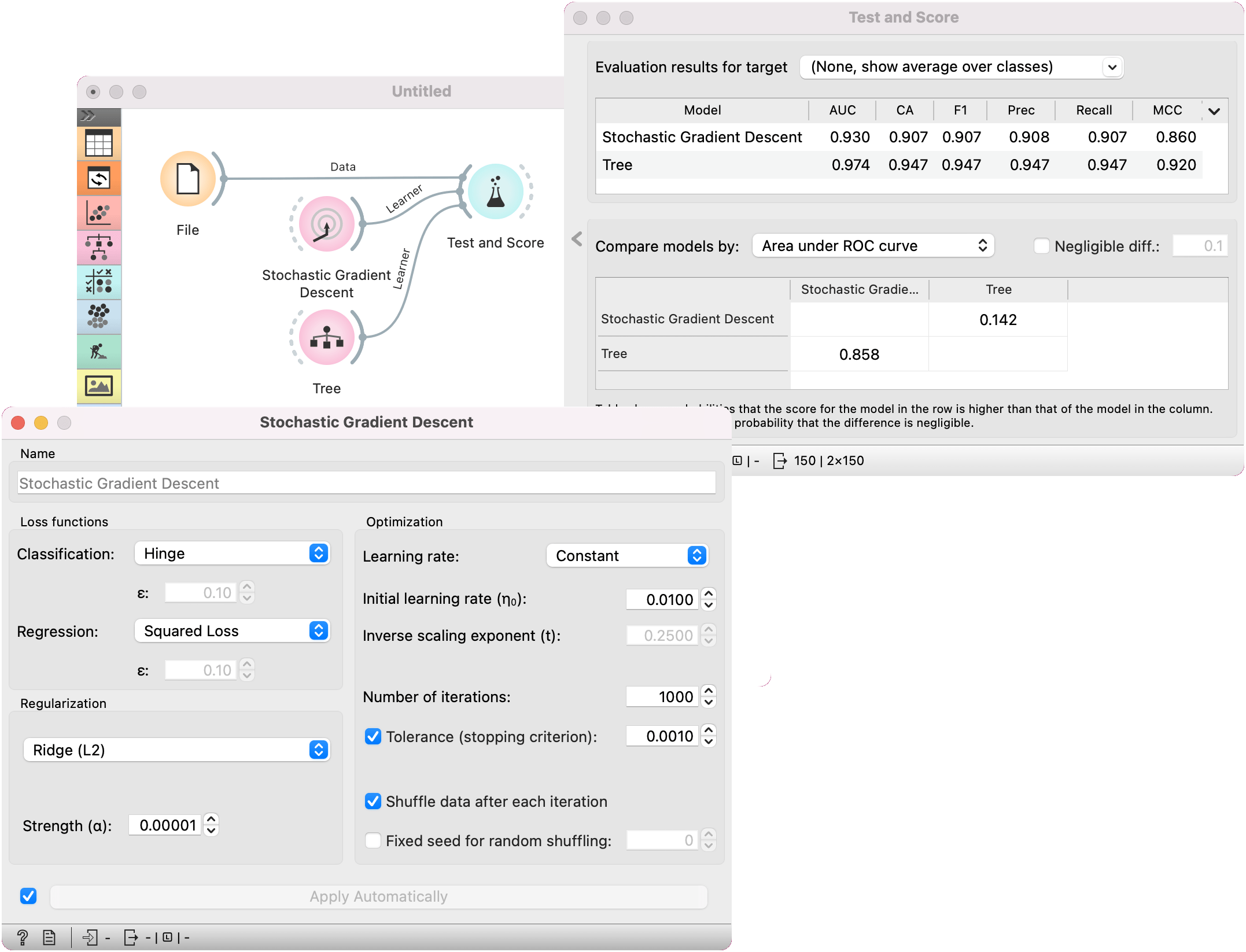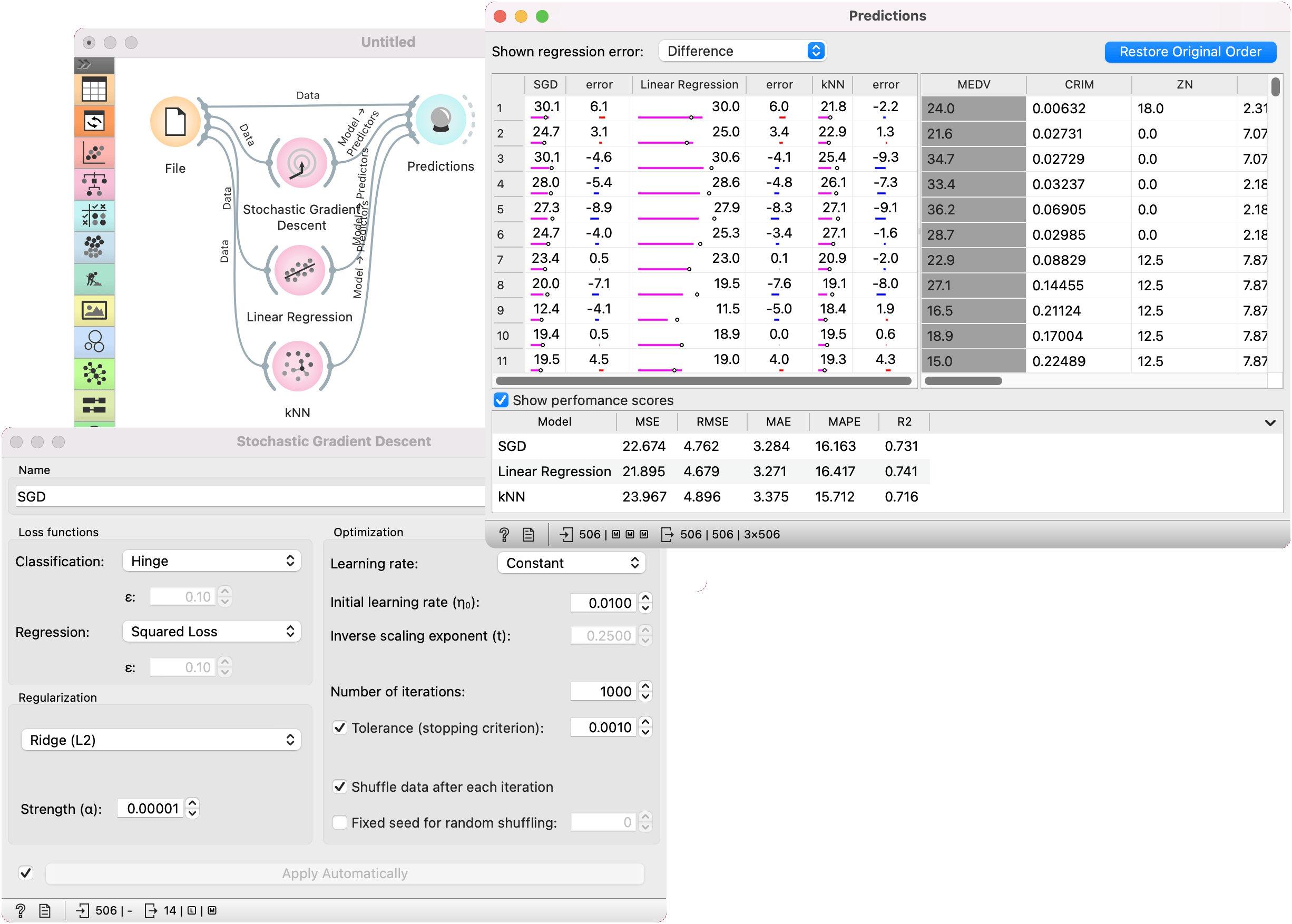 The Stochastic Gradient Descent widget uses stochastic gradient descent that minimizes a chosen loss function with a linear function. The algorithm approximates a true gradient by considering one sample at a time, and simultaneously updates the model based on the gradient of the loss function. For regression, it returns predictors as minimizers of the sum, i.e. M-estimators, and is especially useful for large-scale and sparse datasets.