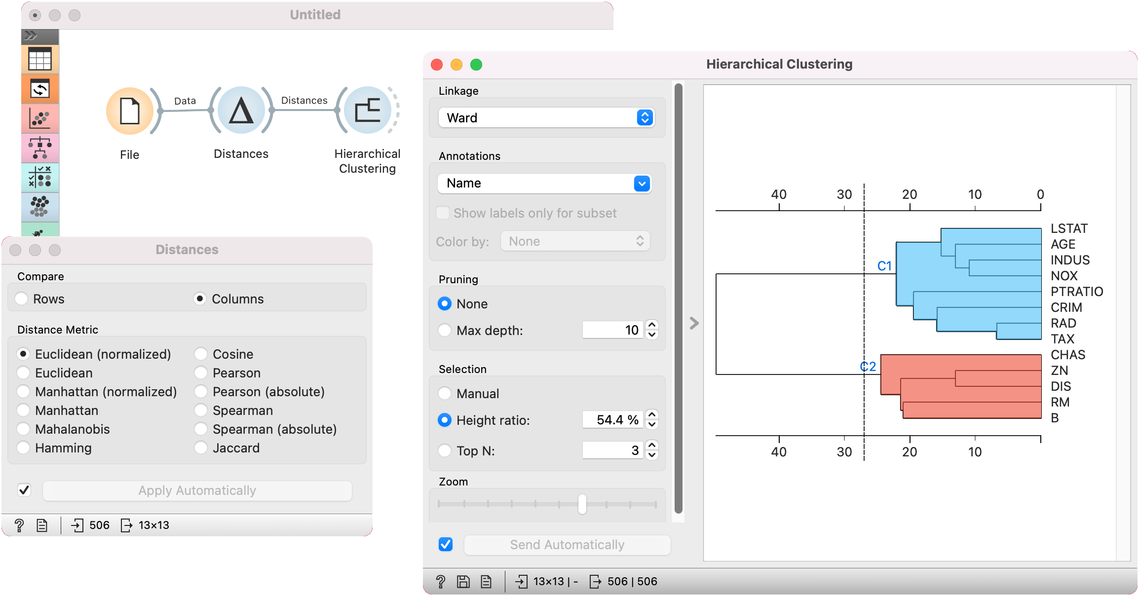 The resulting distance matrix can be fed further to Hierarchical Clustering for uncovering groups in the data, to Distance Map or Distance Matrix for visualizing the distances (Distance Matrix can be quite slow for larger data sets), to MDS for mapping the data instances using the distance matrix and finally, saved with Save Distance Matrix. Distance file can be loaded with Distance File.