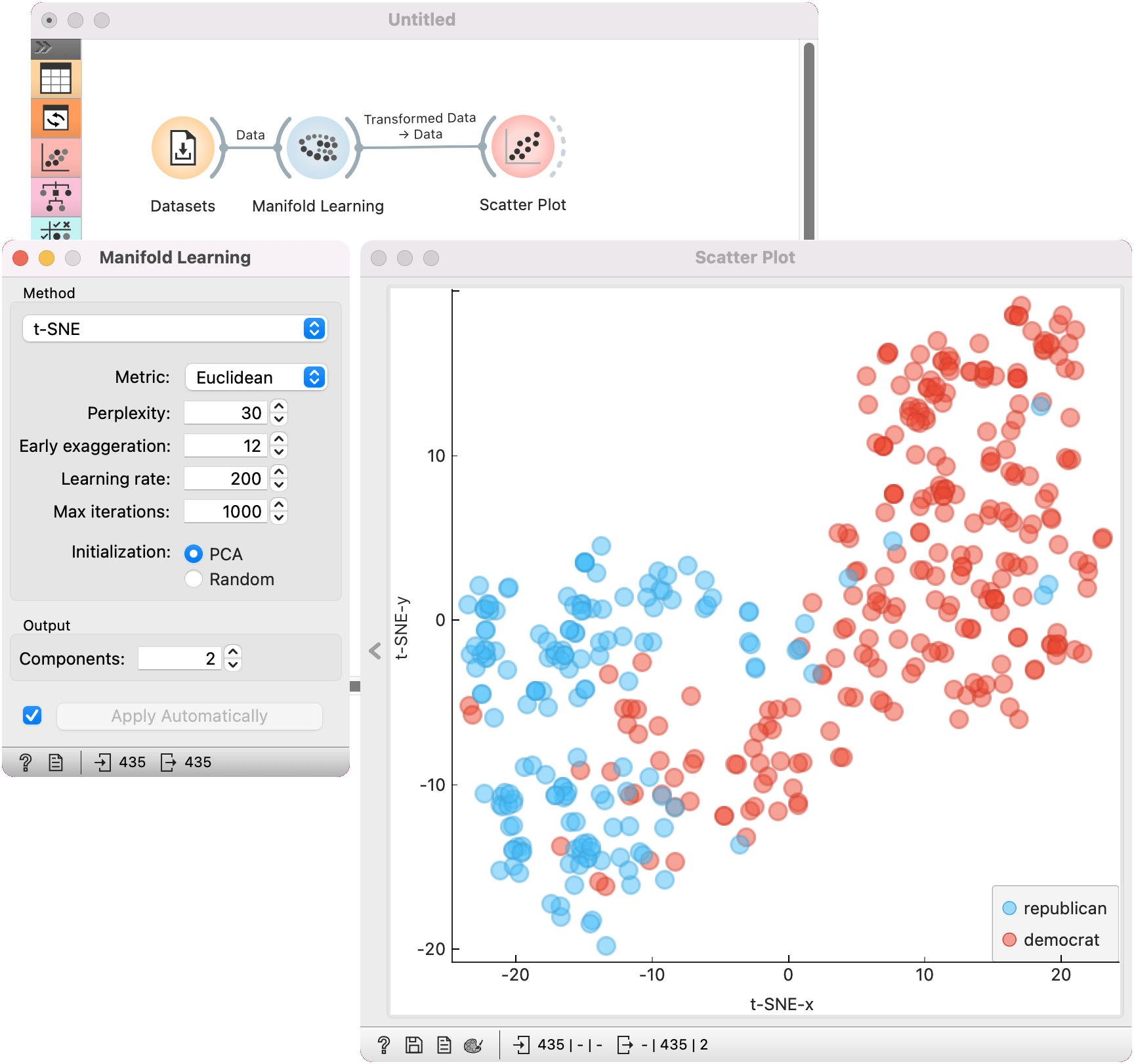 Manifold Learning widget transforms high-dimensional data into a lower dimensional approximation. This makes it great for visualizing datasets with many features. We used voting.tab to map 16-dimensional data onto a 2D graph. Then we used Scatter Plot to plot the embeddings.